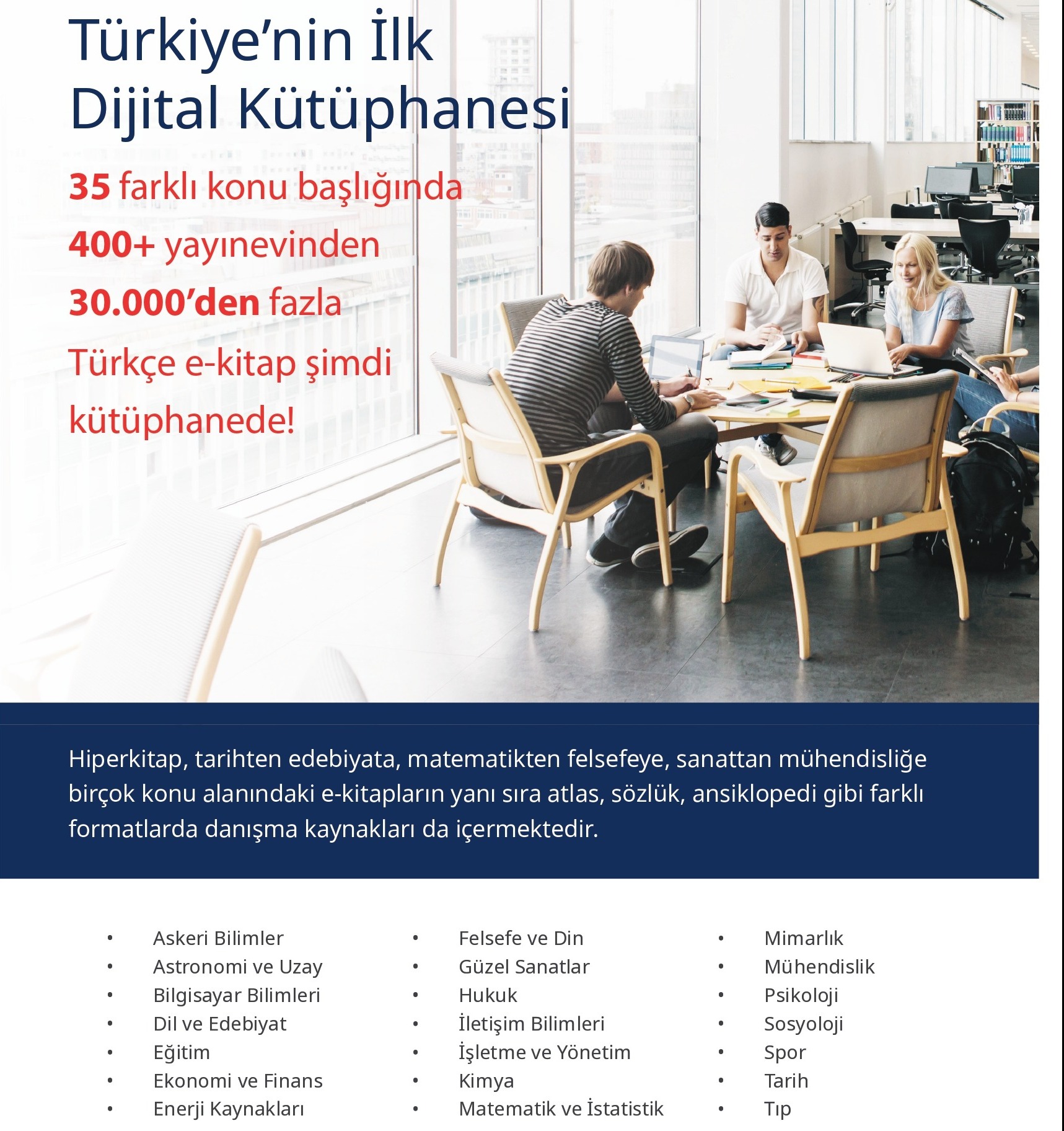Hiperkitap sahip olduğu 30.000'den fazla Türkçe içerik ile Türkiye’nin ilk e-kitap veritabanıdır.