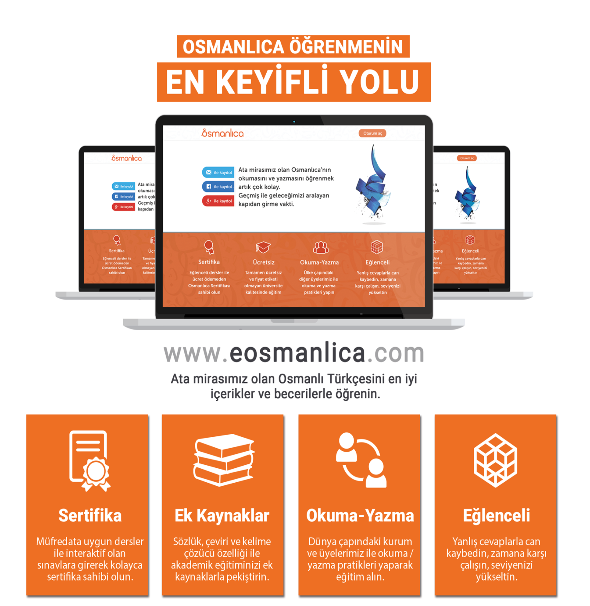 Osmanlı Türkçesini öğretmeyi hedefleyen toplam 79 dersten oluşan bir eğitim platformudur. Doğru/yanlış, eşleştirme, şıklı sorular ve gördüğünü yaz gibi yöntemlerle kurgulanan oyunlaştırılmış sistem sayesinde e-Osmanlıca, her yaş grubuna yönelik olarak öğrenme sürecini destekleyecek şekilde tasarlanmıştır.
