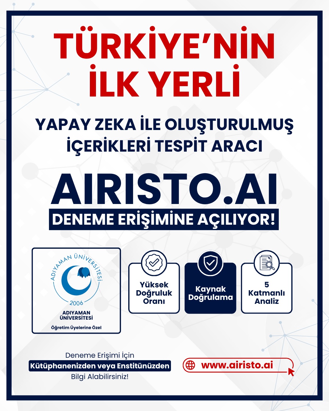 Airisto, tamamen yerli kaynaklarla geliştirilmiş bir yapay zekâ içerik tespit aracıdır. Türkçe ve İngilizce akademik metinleri (tez, makale, seminer, bildiri vb.) çok katmanlı yöntemlerle incelemekte ve “olası” yapay zekâ üretimi izlerini şeffaf, anlaşılır çıktılarla rapor almaktadır.